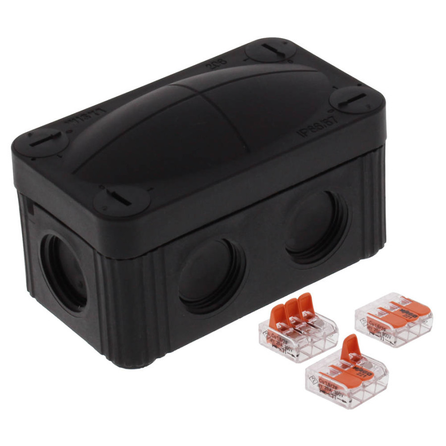Опис Розподільна коробка COMBI 206 BK / 3xWAGO 221-413 85x49x51мм, RAL 9005, з клемами 3x WAGO 221-413